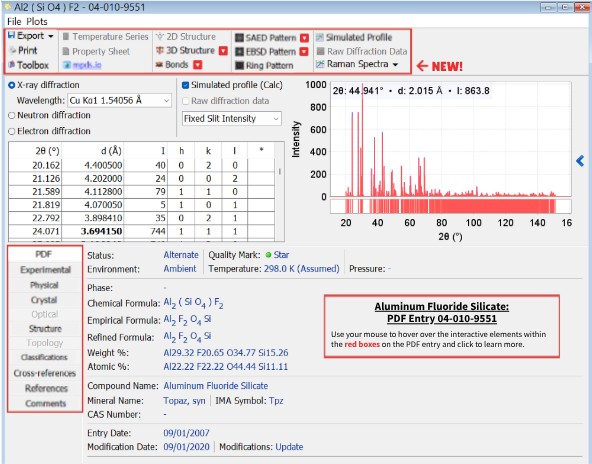 Classifications: This tab displays the various classifications for the PDF entry, such as the subfiles and mineral/zeolite classifications.
