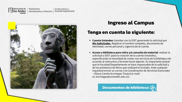 - Acceso a biblioteca para retiro y/o consulta de material: realizar la solicitud a DSIT (para la creación de la cuenta Uniandes), especificando la necesidad de contar con servicios de la biblioteca de acuerdo al instructivo y formato Excel adjunto. Es importante aclarar que la Facultad/Departamento se hace responsable de la solicitud y de los préstamos de libros que realizará el invitado. Ante cualquier inquietud enviar un correo a la Coordinación de Servicios Esenciales – Eliana Camila Arciniegas Tinjacá (e-mail: ec.arciniegas@uniandes.edu.co).