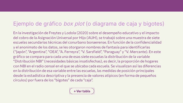 En la investigación de Freytes y Lodola (2020) sobre el desempeño educativo y el impacto del cobro de la Asignación Universal por Hijo (AUH), se trabajó sobre una muestra de siete escuelas secundarias técnicas del conurbano bonaerense. En función de la confidencialidad y el anonimato de los datos, se les otorgaron nombres de fantasía para identificarlas (“Japón”, “Argentina”, “OEA”, “A. Ferreyra”, “V. Sarsfield”, “Paraguay” y “V. Mercante). En este gráfico se compara para cada una de esas siete escuelas la distribución de la variable “Distribución NBI” (necesidades básicas insatisfechas), es decir, la proporción de hogares con NBI en el radio censal en el que se ubicaba cada escuela. Se visualizan así las diferencias en la distribución de esa variable entre las escuelas, las medidas de posición principales desde la estadística descriptiva y la presencia de valores atípicos (en forma de pequeños círculos) por fuera de los “bigotes” de cada “caja”.