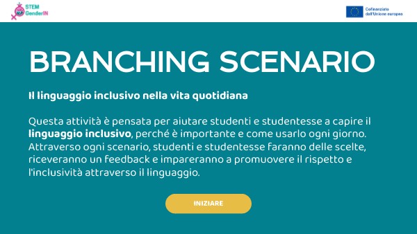 Il linguaggio inclusivo nella vita quotidiana Questa attività è pensata per aiutare studenti e studentesse a capire il linguaggio inclusivo, perché è importante e come usarlo ogni giorno. Attraverso ogni scenario, studenti e studentesse faranno delle scelte, riceveranno un feedback e impareranno a promuovere il rispetto e l'inclusività attraverso il linguaggio.