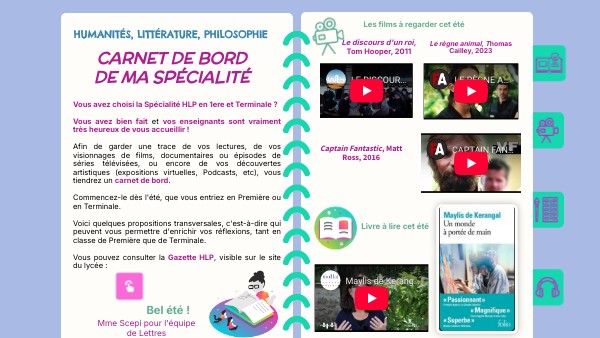Vous avez choisi la Spécialité HLP en 1ere et Terminale ? Vous avez bien fait et vos enseignants sont vraiment très heureux de vous accueillir ! Afin de garder une trace de vos lectures, de vos visionnages de films, documentaires ou épisodes de séries télévisées, ou encore de vos découvertes artistiques (expositions virtuelles, Podcasts, etc), vous tiendrez un carnet de bord. Commencez-le dès l'été, que vous entriez en Première ou en Terminale. Voici quelques propositions transversales, c'est-à-dire qui peuvent vous permettre d'enrichir vos réflexions, tant en classe de Première que de Terminale. Vous pouvez consulter la Gazette HLP, visible sur le site du lycée :