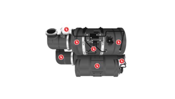 Two 5 kW integrated heaters efficiently support NOx conversion during startup and low-load conditions. They provide consistent heat through a 48-volt alternator mounted to the engine, connected via cold pins.