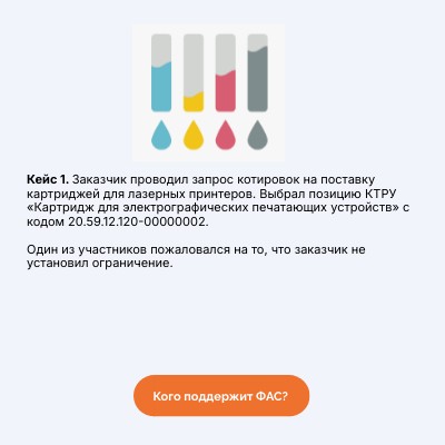 Кейс 1. Заказчик проводил запрос котировок на поставку картриджей для лазерных принтеров. Выбрал позицию КТРУ «Картридж для электрографических печатающих устройств» с кодом 20.59.12.120-00000002. Один из участников пожаловался на то, что заказчик не установил ограничение.