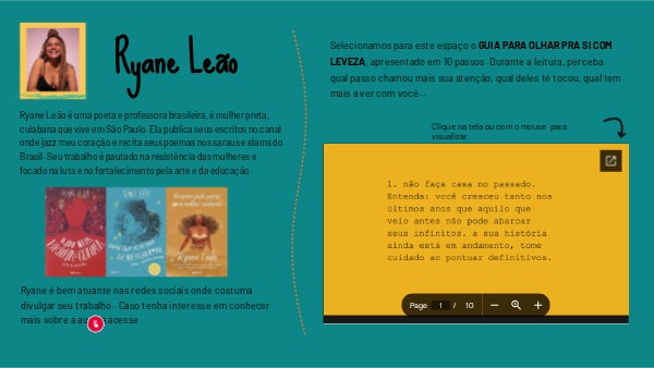 Ryane Leão é uma poeta e professora brasileira, é mulher preta, cuiabana que vive em São Paulo. Ela publica seus escritos no canal onde jazz meu coração e recita seus poemas nos saraus e slams do Brasil. Seu trabalho é pautado na resistência das mulheres e focado na luta e no fortalecimento pela arte e da educação.