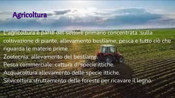 L'agricoltura è parte del settore primario concentrata :sulla coltivazione di piante, allevamento bestiame, pesca e tutto ciò che riguarda le materie prime.Zootecnia: allevamento del bestiame.Pesca commerciale: cattura di specie ittiche. Acquacoltura:allevamento delle specie ittiche. Silvicoltura:sfruttamento delle foreste per ricavare il legno.