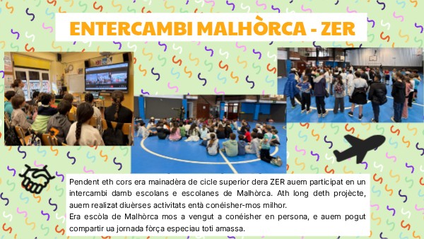 Pendent eth cors era mainadèra de cicle superior dera ZER auem participat en un intercambi damb escolans e escolanes de Malhòrca. Ath long deth projècte, auem realizat diuèrses activitats entà conéisher-mos milhor. Era escòla de Malhòrca mos a vengut a conéisher en persona, e auem pogut compartir ua jornada fòrça especiau toti amassa.