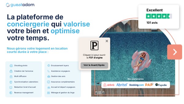 Guestadom est une plateforme française qui vous aide à générer des revenus locatifs, rapidement et sans effort. Spécialiste de la location courte durée, nous combinons technologie et réseau de concierges locaux pour gérer votre logement de A à Z : ✔️ Shooting + multi-diffusion (Airbnb, Booking, Abritel…) ✔️ Concierges partenaires dans toute la France ✔️ Ménage, intendance et gestion des voyageurs