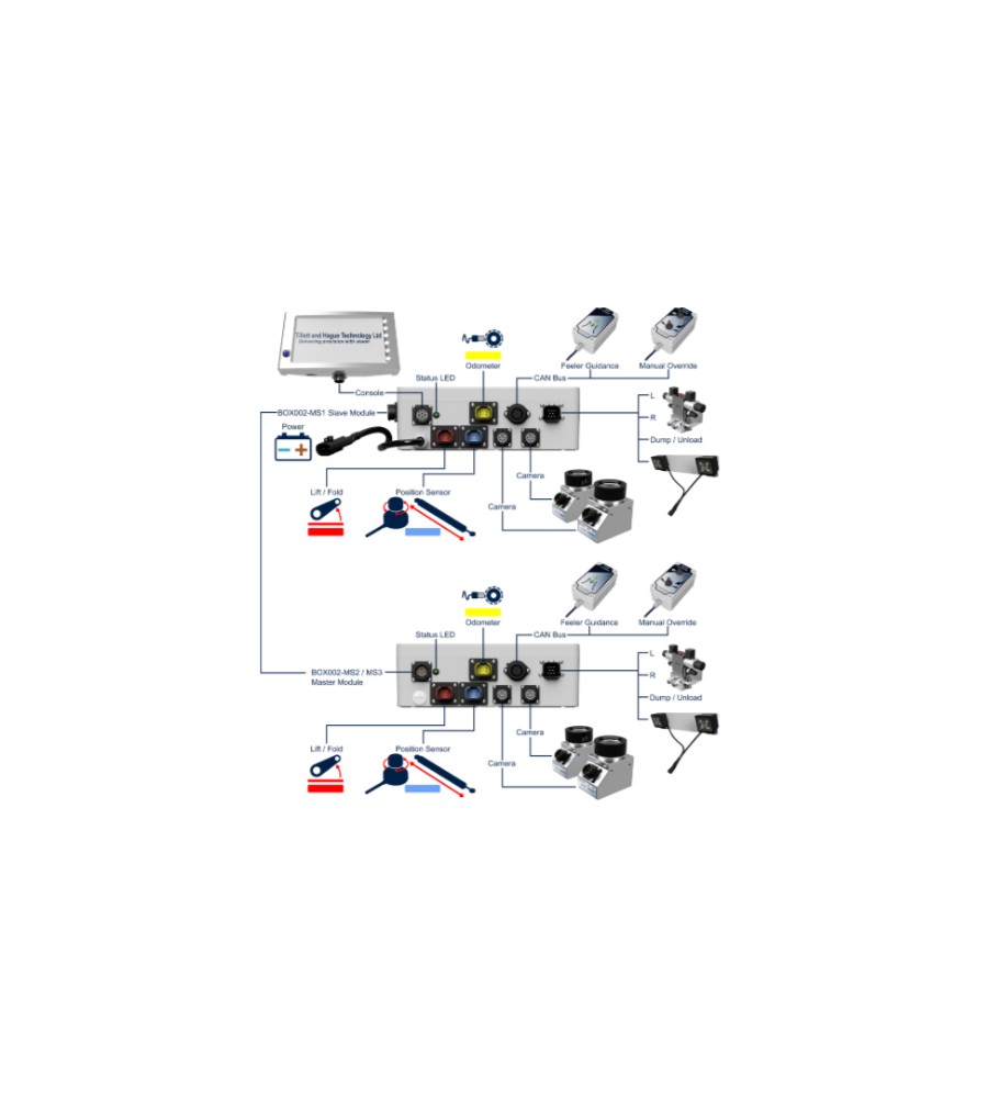 Slave modules are identical to normal modules except they have no independent 12V power lead, and the “console” connector has a male gender for connection to the master module. All the other inputs and outputs function as normal though data can be shared between sections. For example, lift and speed might be common between sections and only require one data source.