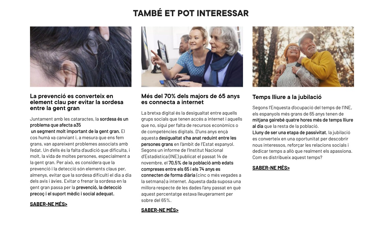 Juntament amb les cataractes, la sordesa és un problema que afecta a35 un segment molt important de la gent gran. El cos humà va canviant i, a mesura que ens fem grans, van apareixent problemes associats amb l’edat. Un d’ells és la falta d’audició que dificulta, i molt, la vida de moltes persones, especialment a la gent gran. Per això, es considera que la prevenció i la detecció són elements claus per, almenys, evitar que la sordesa dificulti el dia a dia dels avis i àvies. Evitar o frenar la sordesa en la gent gran passa per la prevenció, la detecció precoç i el suport mèdic i social adequat.