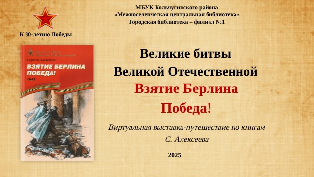 Дорогие читатели! Эта книга посвящена взятию Берлина и победному завершению одной из самых кровопролитных войн в истории. Из нее вы узнаете о цене последних метров, оставшихся до рейхстага, об изобретательности наших солдат, о том, как они спасали в горящем Берлине немецких детей, и о том, как взвился наш флаг над немецкой столицей. Ждем Вас в нашей библиотеке по адресу: Кольчугино, ул. Ломако д. 18 Время работы: с 1000 до 1800 Перерыв – с 1300 до 1400 Выходной день – Воскресенье Последний день месяца – санитарный день.