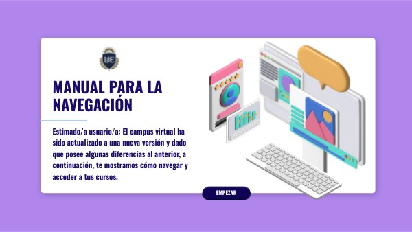 Estimado/a usuario/a: El campus virtual ha sido actualizado a una nueva versión y dado que posee algunas diferencias al anterior, a continuación, te mostramos cómo navegar y acceder a tus cursos.