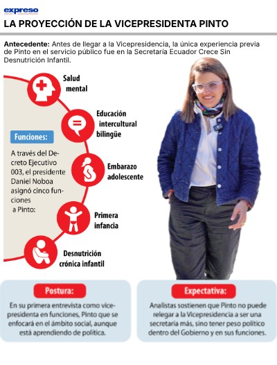 Antecedente: Antes de llegar a la Vicepresidencia, la única experiencia previa de Pinto en el servicio público fue en la Secretaría Ecuador Crece Sin Desnutrición Infantil.