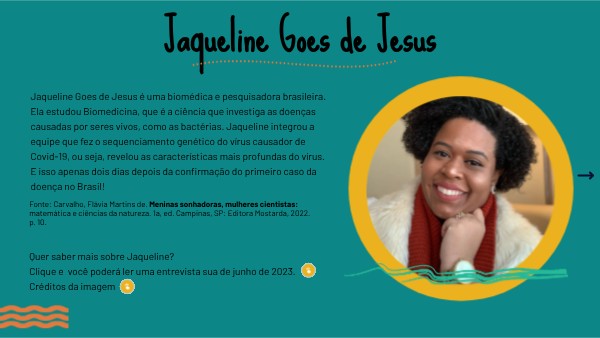 Jaqueline Goes de Jesus é uma biomédica e pesquisadora brasileira. Ela estudou Biomedicina, que é a ciência que investiga as doenças causadas por seres vivos, como as bactérias. Jaqueline integrou a equipe que fez o sequenciamento genético do vírus causador de Covid-19, ou seja, revelou as características mais profundas do vírus.