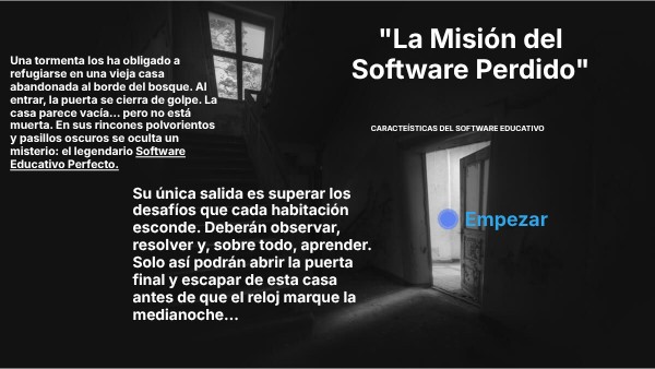 Una tormenta los ha obligado a refugiarse en una vieja casa abandonada al borde del bosque. Al entrar, la puerta se cierra de golpe. La casa parece vacía… pero no está muerta. En sus rincones polvorientos y pasillos oscuros se oculta un misterio: el legendario Software Educativo Perfecto.