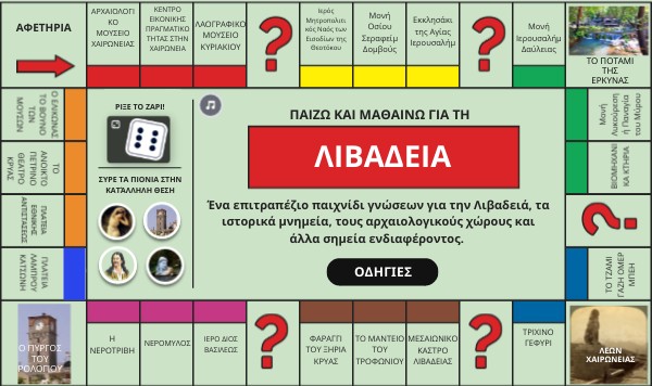 Τοποθέτησε τα πιόνια στην αφετηρία. Κάνε κλικ στο ζάρι και οδήγησε το πιόνι σου στην κατάλληλη θέση. Κάνε κλικ στο διαδραστικό εικονίδιο και μάθε περισσότερα για τα μνημεία και τα αξιοθέατα της Λιβαδειάς