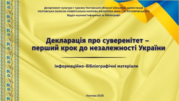 Дорога України до незалежності була довгою й тернистою. Впродовж століть український народ виборював право жити у власній державі, говорити рідною мовою, зберігати свою культуру й самостійно вирішувати свою долю. Кінець 1980-х став часом великих змін: радянська система слабшала, а в серцях мільйонів українців зростало прагнення до волі. Саме в цьому історичному контексті, 16 липня 1990 року, Україна проголосила Декларацію про державний суверенітет — перший офіційний крок до справжньої незалежності. Цей день став символом національного пробудження та віри у майбутнє, з якого розпочався новий етап в історії державотворення. Відділом наукової інформації та бібліографії підготовано інформаційно-бібліографічні матеріали "Декларація про суверенітет – перший крок до незалежності України", які допоможуть детальніше ознайомитися із ключовими документами, дослідженнями та публікаціями, що висвітлюють історичне значення проголошення Декларації про державний суверенітет України. Представлені джерела допоможуть глибше зрозуміти передумови, зміст та наслідки цього історичного рішення для українського державотворення.