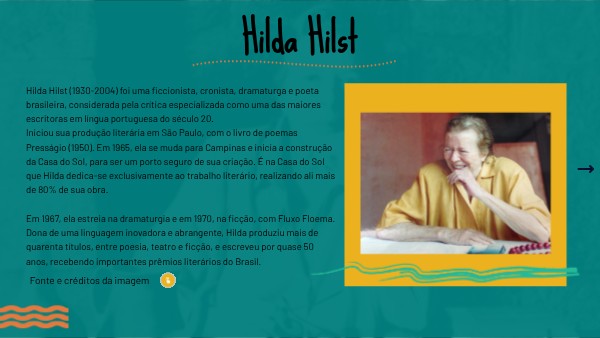 Hilda Hilst (1930-2004) foi uma ficcionista, cronista, dramaturga e poeta brasileira, considerada pela crítica especializada como uma das maiores escritoras em língua portuguesa do século 20. Iniciou sua produção literária em São Paulo, com o livro de poemas Presságio (1950). Em 1965, ela se muda para Campinas e inicia a construção da Casa do Sol, para ser um porto seguro de sua criação. É na Casa do Sol que Hilda dedica-se exclusivamente ao trabalho literário, realizando ali mais de 80% de sua obra. Em 1967, ela estreia na dramaturgia e em 1970, na ficção, com Fluxo Floema. Dona de uma linguagem inovadora e abrangente, Hilda produziu mais de quarenta títulos, entre poesia, teatro e ficção, e escreveu por quase 50 anos, recebendo importantes prêmios literários do Brasil.