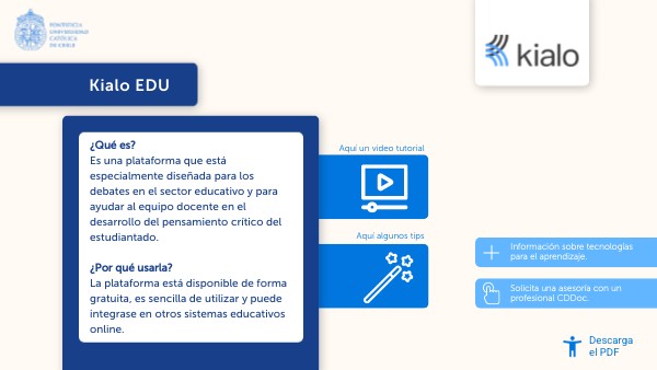 ¿Qué es? Es una plataforma que está especialmente diseñada para los debates en el sector educativo y para ayudar al equipo docente en el desarrollo del pensamiento crítico del estudiantado. ¿Por qué usarla? La plataforma está disponible de forma gratuita, es sencilla de utilizar y puede integrase en otros sistemas educativos online.