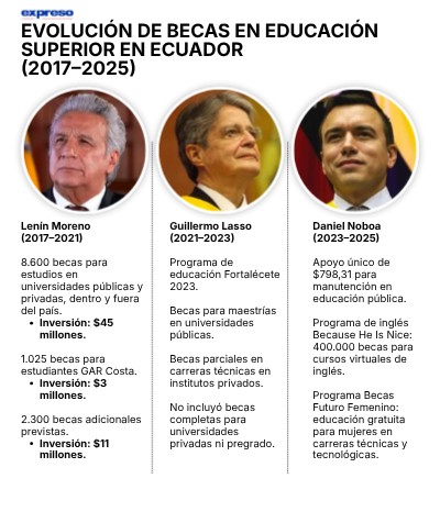 Guillermo Lasso (2021–2023) Programa de educación Fortalécete 2023. Becas para maestrías en universidades públicas. Becas parciales en carreras técnicas en institutos privados. No incluyó becas completas para universidades privadas ni pregrado.
