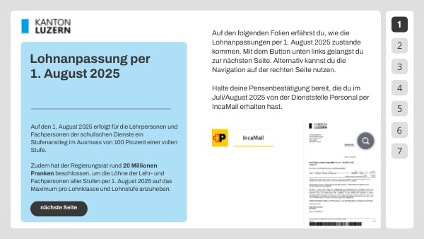 Auf den folgenden Folien erfährst du, wie die Lohnanpassungen per 1. August 2025 zustande kommen. Mit dem Button unten links gelangst du zur nächsten Seite. Alternativ kannst du die Navigation auf der rechten Seite nutzen. Halte deine Pensenbestätigung bereit, die du im Juli/August 2025 von der Dienststelle Personal per IncaMail erhalten hast.