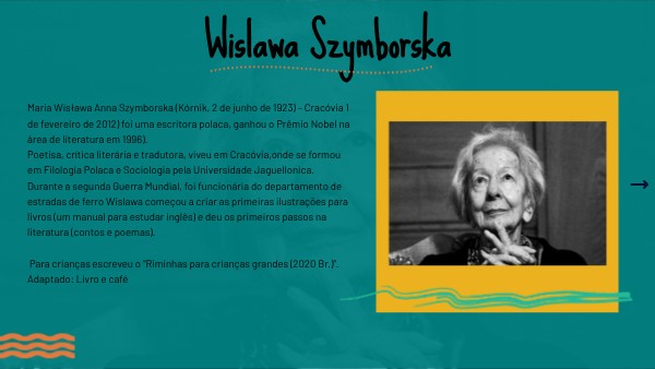 Maria Wisława Anna Szymborska (Kórnik, 2 de junho de 1923) – Cracóvia 1 de fevereiro de 2012) foi uma escritora polaca, ganhou o Prêmio Nobel na área de literatura em 1996). Poetisa, crítica literária e tradutora, viveu em Cracóvia,onde se formou em Filologia Polaca e Sociologia pela Universidade Jaguellonica. Durante a segunda Guerra Mundial, foi funcionária do departamento de estradas de ferro Wislawa começou a criar as primeiras ilustrações para livros (um manual para estudar inglês) e deu os primeiros passos na literatura (contos e poemas). Para crianças escreveu o “Riminhas para crianças grandes (2020 Br.)”. Adaptado: Livro e café