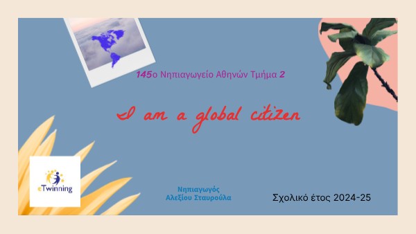 Την τρέχουσα σχολική χρονιά 2024-25 , το Τμήμα 2 θα συμμετάσχει για μια ακόμα φορά σε ευρωπαϊκό eTwinning έργο με τίτλο" I am a global citizen". Το έργο αφορά ηλικίες 3 έως 7 ετών και συμμετέχουν 27 εταίροι από 7 χώρες,Λιθουανία ( ιδρύτρια χώρα), Ελλάδα( συνιδρύτρια) , Τουρκία, Λετονία, Γαλλία, Ιορδανία, Λίβανος. Το έργο θα έχει διάρκεια από τον Οκτώβριο 2024 έως και τον Μάιο 2025.