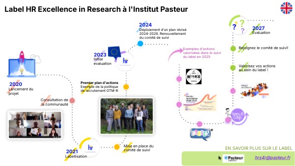 En décembre 2021, l’Institut Pasteur obtient le label HR Excellence in Research. Une page dédiée est mise en ligne sur le site institutionnel afin de présenter la démarche, le premier plan d’action 2021–2023 et les engagements associés. Un comité de suivi est également constitué pour accompagner la mise en œuvre du plan et assurer un suivi régulier de son déploiement.