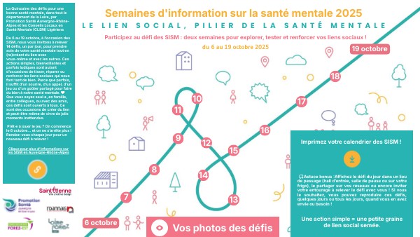 La Quinzaine des défis pour une bonne santé mentale, dans tout le département de la Loire, par Promotion Santé Auvergne-Rhône-Alpes et les Conseils Locaux en Santé Mentale (CLSM) Ligériens Du 6 au 19 octobre, à l’occasion des SISM, nous vous invitons à relever 14 défis, un par jour, pour prendre soin de votre santé mentale tout en (re)créant du lien avecvous-même et avec les autres. Ces actions simples, bienveillantes et parfois ludiques sont autant d’occasions de tisser, réparer ou renforcer les liens sociaux qui nous font tant de bien. Parce que parfois, il suffit d’un sourire, d’un appel, d’un jeu ou d’un goûter partagé pour faire du bien à notre santé mentale.❤️ Que vous soyez seul·e, en famille, entre collègues, ou avec des amis, ces défis sont ouverts à tous. Ce sont des occasions de créer du lien et peut-être même de vivre de jolis moments inattendus. Prêt·e à jouer le jeu ? On commence le 6 octobre… et on ne s’arrête plus ! Rendez-vous chaque jour pour un nouveau défi à relever !