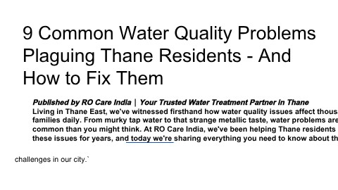 Published by RO Care India | Your Trusted Water Treatment Partner in ThaneLiving in Thane East, we've witnessed firsthand how water quality issues affect thousands of families daily. From murky tap water to that strange metallic taste, water problems are more common than you might think. At RO Care India, we've been helping Thane residents solve these issues for years, and today we're sharing everything you need to know about the water