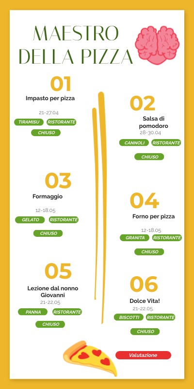 Praca klasowa: Festival della pizza Punkty: Sole; Limone Tabela punktów i wyników: Classifica Pizzaiolo Uczniowie: Bambini Nauczyciel: Giuseppe Każdy Bambini może przygotować swoje przepisy na Festival della pizza zbierając Limoni oraz Sole. W trakcie nauki zawodu Bambini mogą wykonać dwa Pizza picnic, za które otrzymają łączną gratyfikację wagi 1. Aby wejść wygranym na Festival della pizza, Bambini powinien wykonać zadania za minimum 300 sole oraz zgromadzić 200 Limoni. Wstęp na Festival della pizza daje Bambini zdobycie 100% wagi 3. Ocena efektów uczenia się dla wykonywanych ćwiczeń- Limoni 280 Limoni- skreślenie zadania za 4 pkt na Festival della pizza 220 Limoni- skreślenie zadania za 2 pkt na Festival della pizza 150 Limoni- skreślenie zadania za 1 pkt na Festival della pizza