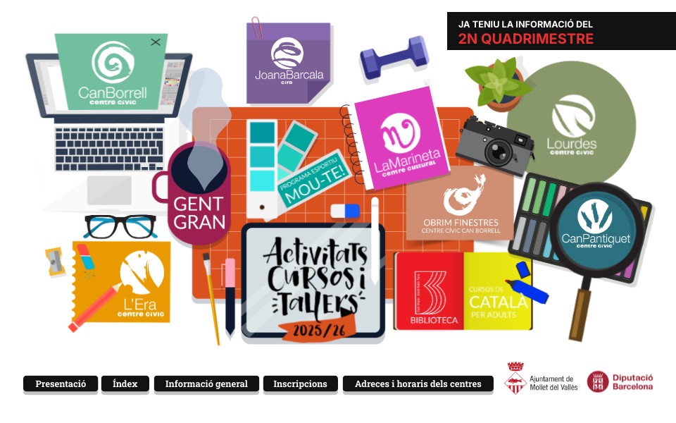 Com cada any, em plau presentar-vos el programa d’activitats, cursos i tallersdels centres cívics i culturals, de dona, de gent gran i esportius per al curs 2025-2026. Iniciem un nou curs als nostres equipaments amb un extens programa que inclouuna gran varietat d’activitats per a totes les edats, gustos i interessos. Trobareu activitats relacionades amb la salut, la dansa, el teatre, les noves tecnologies,el benestar físic i emocional, l’expressió artística, la fotografia, la música... L’Ajuntament de Mollet, conjuntament amb les entitats de la ciutat, hem dissenyatuna programació pensada per omplir de cultura, art i salut la nostra ciutat. Exploreu la programació i no dubteu en gaudir-la. Us esperem als tallers, cursos, concerts, exposicions, xerrades, espais de trobada,sortides i festes. De ben segur que trobareu alguna activitat que s’adapti a les vostres necessitats!