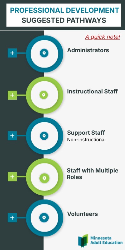 These pathways offer a suggested timeline for how you might complete core PD offerings pertaining to your role. This does not include local or district requirements or offerings. We invite you to tailor the personalized tool (linked on subsequent pages) to your individual and program needs.