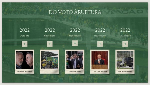 08/01/2023 - Milhares de bolsonaristas que estavam acampados em frente ao Quartel-General do Exército em Brasília marcham até a Esplanada dos Ministérios e invadem, de forma simultânea e coordenada, os prédios do Congresso Nacional, do STF e do Palácio do Planalto. As cenas foram transmitidas ao vivo por canais nas redes sociais: vidraças estilhaçadas, móveis destruídos, obras de arte vandalizadas, documentos oficiais rasgados e ataques simbólicos contra os símbolos da democracia. No STF, a cadeira da presidência foi destruída; no Palácio, quadros históricos foram rasgados ou perfurados. A Polícia Militar do Distrito Federal foi acusada de omissão e até de conivência. Vídeos mostraram agentes assistindo à invasão sem reagir. O governo federal, por meio do presidente Lula, decretou intervenção federal na segurança pública do DF por meio do então interventor Ricardo Cappelli