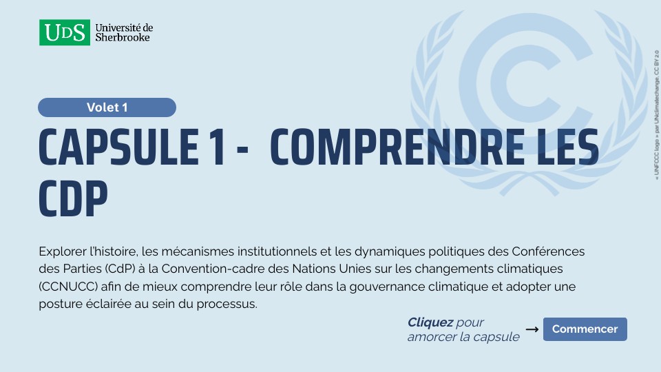 Explorer l’histoire, les mécanismes institutionnels et les dynamiques politiques des Conférences des Parties (CdP) à la Convention-cadre des Nations Unies sur les changements climatiques (CCNUCC) afin de mieux comprendre leur rôle dans la gouvernance climatique et adopter une posture éclairée au sein du processus.