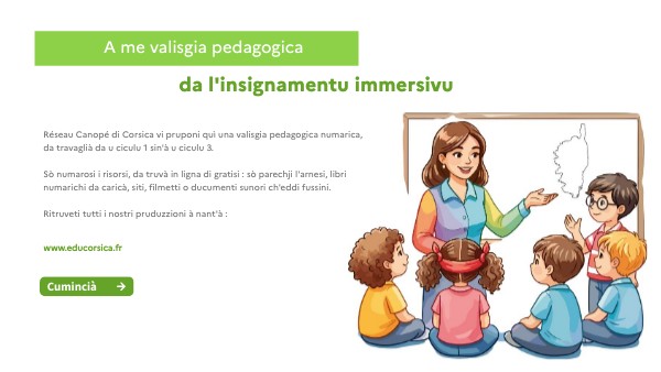 Réseau Canopé di Corsica vi pruponi quì una valisgia pedagogica numarica, da travaglià da u ciculu 1 sin'à u ciculu 3. Sò numarosi i risorsi, da truvà in ligna di gratisi : sò parechji l'arnesi, libri numarichi da caricà, siti, filmetti o ducumenti sunori ch'eddi fussini. Ritruveti tutti i nostri pruduzzioni à nant'à :