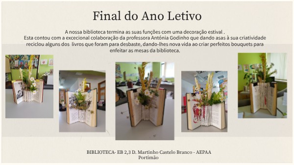 A nossa biblioteca termina as suas funções com uma decoração estival . Esta contou com a excecional colaboração da professora Antónia Godinho que dando asas à sua criatividade reciclou alguns dos livros que foram para desbaste, dando-lhes nova vida ao criar perfeitos bouquets para enfeitar as mesas da biblioteca.