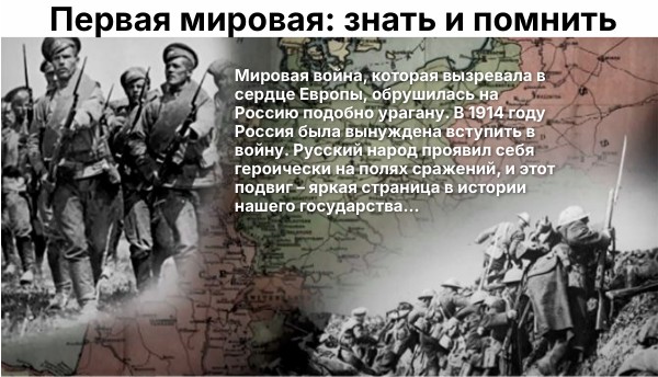 Мировая война, которая вызревала в сердце Европы, обрушилась на Россию подобно урагану. В 1914 году Россия была вынуждена вступить в войну. Русский народ проявил себя героически на полях сражений, и этот подвиг – яркая страница в истории нашего государства…