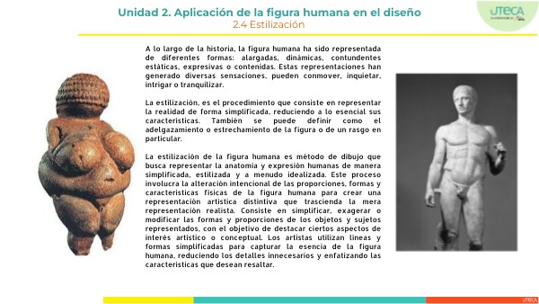 A lo largo de la historia, la figura humana ha sido representada de diferentes formas: alargadas, dinámicas, contundentes estáticas, expresivas o contenidas. Estas representaciones han generado diversas sensaciones, pueden conmover, inquietar, intrigar o tranquilizar. La estilización, es el procedimiento que consiste en representar la realidad de forma simplificada, reduciendo a lo esencial sus características. También se puede definir como el adelgazamiento o estrechamiento de la figura o de un rasgo en particular. La estilización de la figura humana es método de dibujo que busca representar la anatomía y expresión humanas de manera simplificada, estilizada y a menudo idealizada. Este proceso involucra la alteración intencional de las proporciones, formas y características físicas de la figura humana para crear una representación artística distintiva que trascienda la mera representación realista. Consiste en simplificar, exagerar o modificar las formas y proporciones de los objetos y sujetos representados, con el objetivo de destacar ciertos aspectos de interés artístico o conceptual. Los artistas utilizan líneas y formas simplificadas para capturar la esencia de la figura humana, reduciendo los detalles innecesarios y enfatizando las características que desean resaltar.