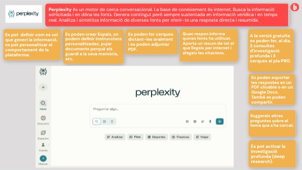 Perplexity és un motor de cerca conversacional. La base de coneixement és internet. Busca la informació sol·licitada i en dóna les fonts. Genera contingut però sempre sustentada en informació verídica i en temps real. Analitza i sintetitza informació de diverses fonts per oferir-te una resposta directa i resumida.