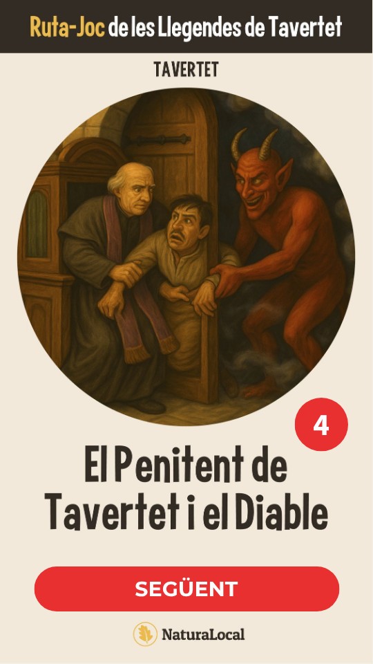 Desesperat, l’home va córrer pels camins foscos fins a Tavertet. Les campanes de l’església ja començaven a tocar les dotze quan va arribar al confessionari. No va trigar a aparèixer el diable, somrient i segur de la seva victòria. —Ha arribat l’hora, la teva ànima és meva! —va bramar el diable. Davant la negativa desesperada del penitent, el diable va començar a estirar-lo amb força. El sacerdot, decidit a protegir-lo, el va aferrar amb l’estola, i tots dos van ser arrossegats cap a la porta. La batalla era ferotge, la força demoníaca semblava imparable. Però just abans que sonés l’última campanada, el confessionari es va quedar travat a la porta. El diable, furiós i derrotat, va desaparèixer entre un núvol de fum i sofre. Des de llavors, el confessionari de Sant Cristòfol de Tavertet roman prop del portal, com a testimoni mut d’aquella nit en què un home va desafiar les forces de l’infern i va trobar refugi en la fe.