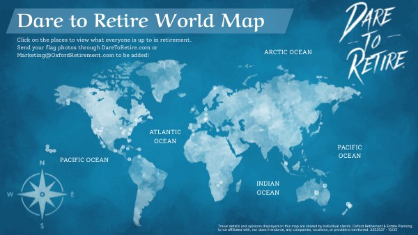 Click on the places to view what everyone is up to in retirement.Send your flag photos through DareToRetire.com or Marketing@OxfordRetirement.com to be added!