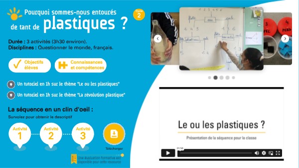 Durée : 50 min. Déroulé : L'enseignant demande aux élèves de comparer les plastiques à d'autres catégories de matière, pour découvrir les propriétés de ces matériaux.