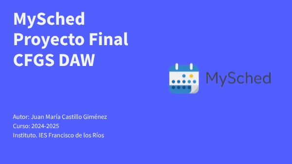 MySched es una aplicación web de tipo calendario. Actualmente permite a los usuarios gestionar sus calendarios y eventos de manera sencilla.
