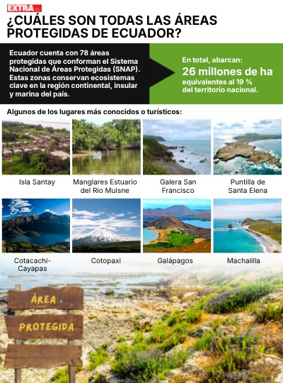 Ecuador cuenta con 78 áreas protegidas que conforman el Sistema Nacional de Áreas Protegidas (SNAP). Estas zonas conservan ecosistemas clave en la región continental, insular y marina del país.