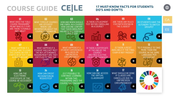 The CELE course programme comprises general language courses that, for over two decades, have been offered annually by the CE|LE Advisory Unit — part of the Languages and Terminology Service — which specialises in Catalan and Spanish as foreign languages. This programme is specifically designed for literate adults (aged 18 and over) who are learning Catalan and/or Spanish as foreign languages. In other words: