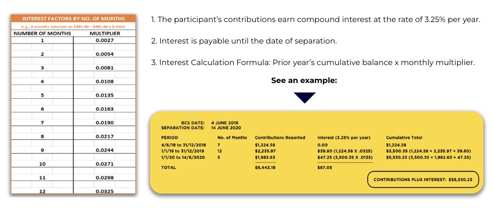 1. The participant’s contributions earn compound interest at the rate of 3.25% per year. 2. Interest is payable until the date of separation. 3. Interest Calculation Formula: Prior year’s cumulative balance x monthly multiplier.