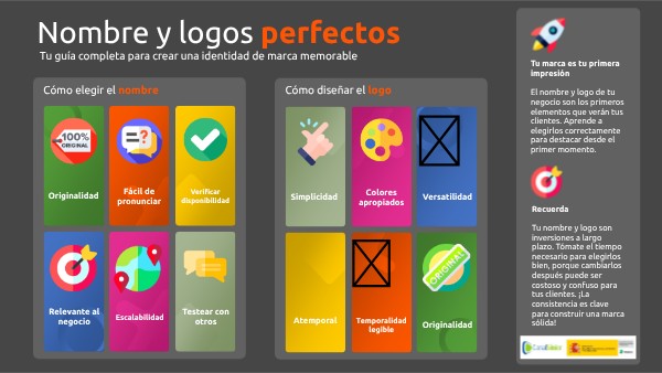 Recuerda Tu nombre y logo son inversiones a largo plazo. Tómate el tiempo necesario para elegirlos bien, porque cambiarlos después puede ser costoso y confuso para tus clientes. ¡La consistencia es clave para construir una marca sólida!