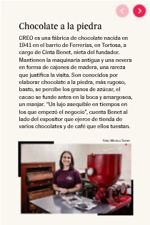 CREO es una fábrica de chocolate nacida en 1941 en el barrio de Ferrerías, en Tortosa, a cargo de Cinta Benet, nieta del fundador. Mantienen la maquinaria antigua y una nevera en forma de cajones de madera, una rareza que justifica la visita. Son conocidos por elaborar chocolate a la piedra, más rugoso, basto, se percibe los granos de azúcar, el cacao se funde antes en la boca y amargosea, un manjar. “Un lujo asequible en tiempos en los que empezó el negocio”, cuenta Benet al lado del expositor que ejerce de tienda de varios chocolates y de café que ellos tuestan.