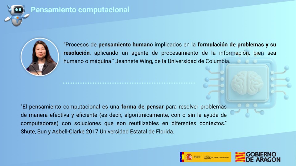 “Procesos de pensamiento humano implicados en la formulación de problemas y su resolución, aplicando un agente de procesamiento de la información, bien sea humano o máquina." Jeannete Wing, de la Universidad de Columbia.
