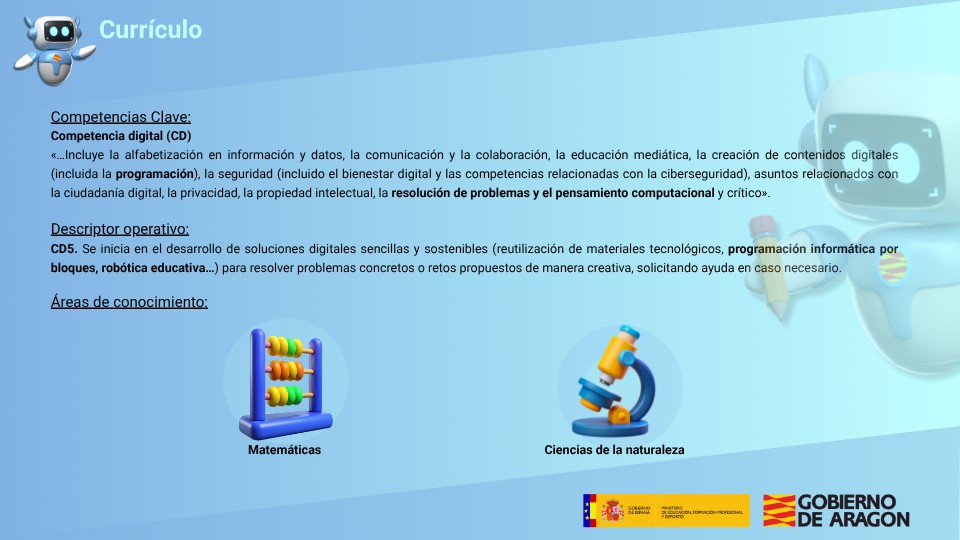 Competencia digital (CD) «…Incluye la alfabetización en información y datos, la comunicación y la colaboración, la educación mediática, la creación de contenidos digitales (incluida la programación), la seguridad (incluido el bienestar digital y las competencias relacionadas con la ciberseguridad), asuntos relacionados con la ciudadanía digital, la privacidad, la propiedad intelectual, la resolución de problemas y el pensamiento computacional y crítico». CD5. Se inicia en el desarrollo de soluciones digitales sencillas y sostenibles (reutilización de materiales tecnológicos, programación informática por bloques, robótica educativa…) para resolver problemas concretos o retos propuestos de manera creativa, solicitando ayuda en caso necesario.